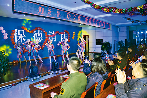 近日,保德縣委宣傳部、縣文化局組織文藝工作者走進(jìn)駐地警營(yíng),為他們書寫春聯(lián),并獻(xiàn)上了精彩的文藝演出。圖為演出現(xiàn)場(chǎng)。(李富永 攝)
