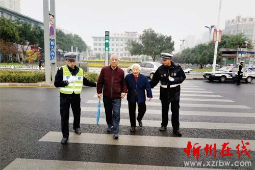 圖四:10 月15 日,交警在七一路與利民街十字路口引導行人過馬路