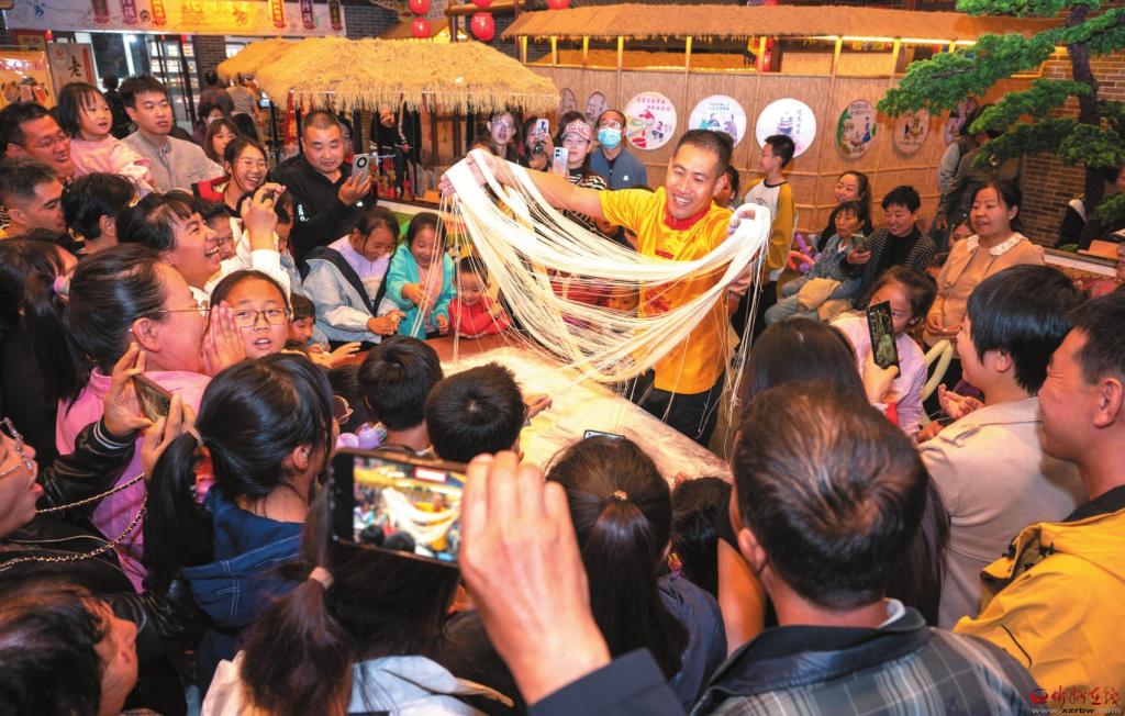 國慶、中秋雙節(jié)期間,代州古城以精彩紛呈的夜生活迎接八方游客。左圖為面食絕活展示引人注目。(王晉東攝