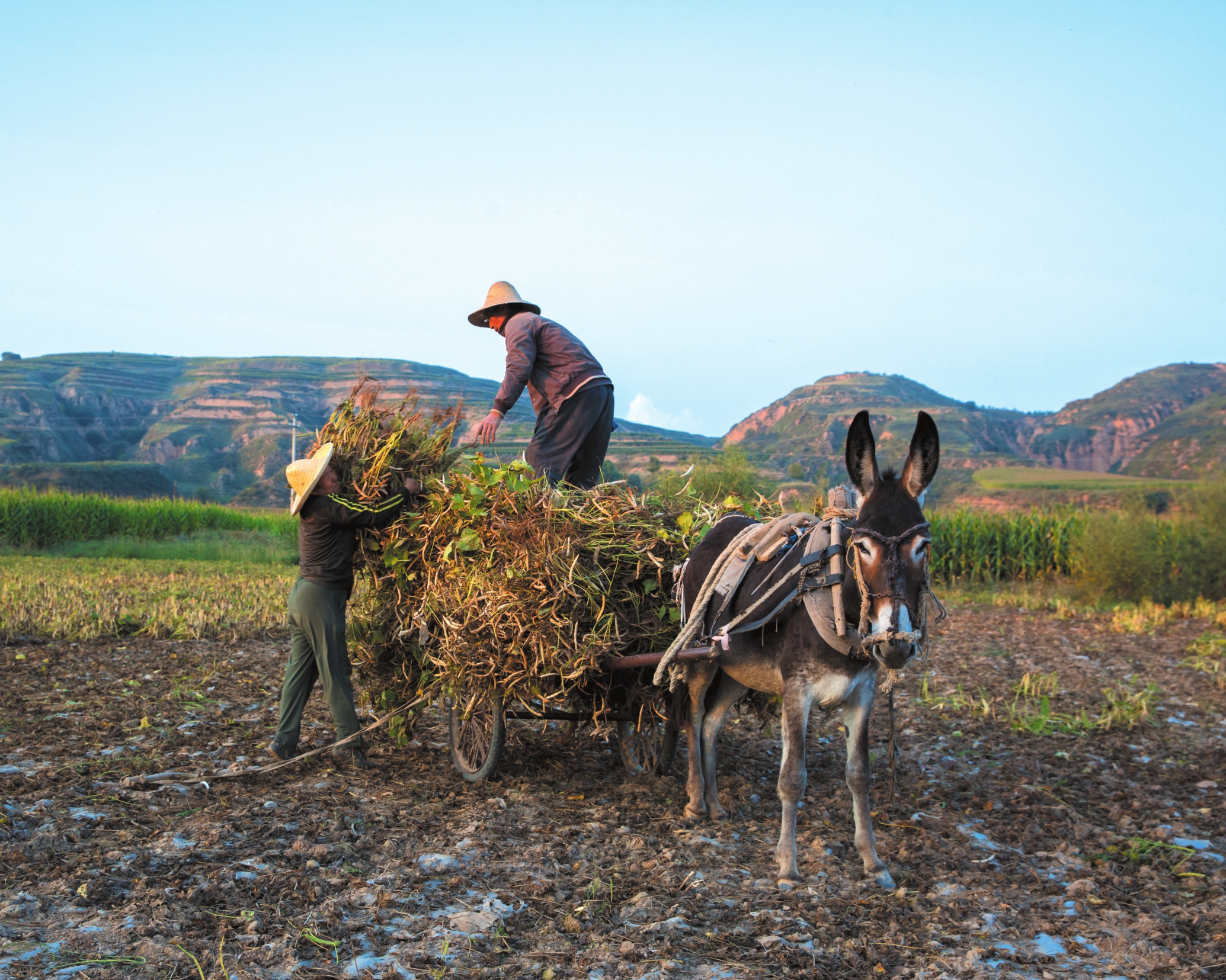 金秋十月,靜樂縣王村鎮(zhèn)三山村的田間一派豐收景象。圖中,頭戴草帽的村民正將收割后的豆角秸稈整齊捆扎,麻利地裝上驢車。(呂芳攝)