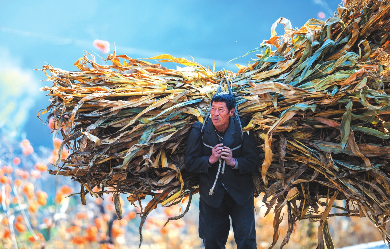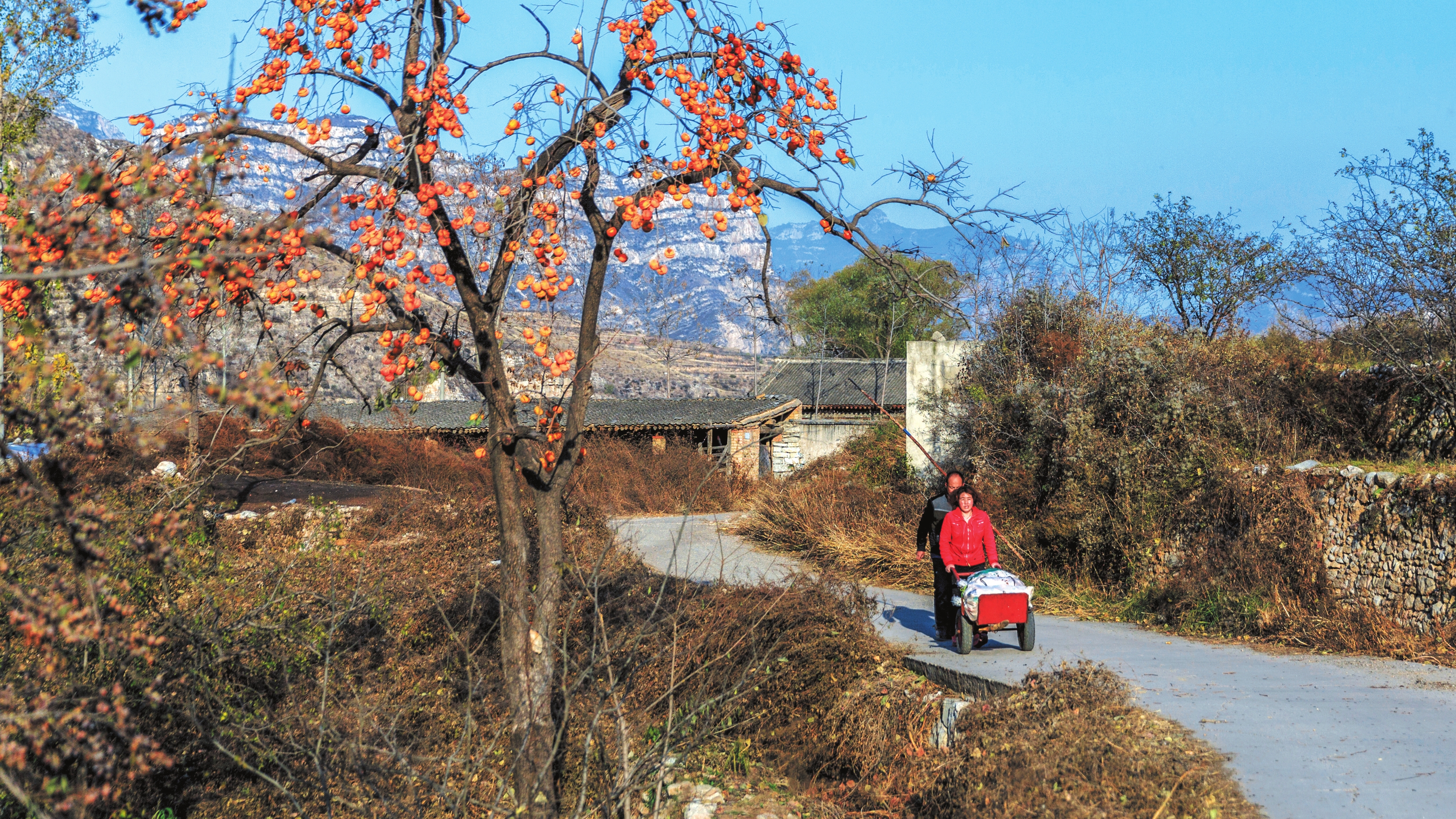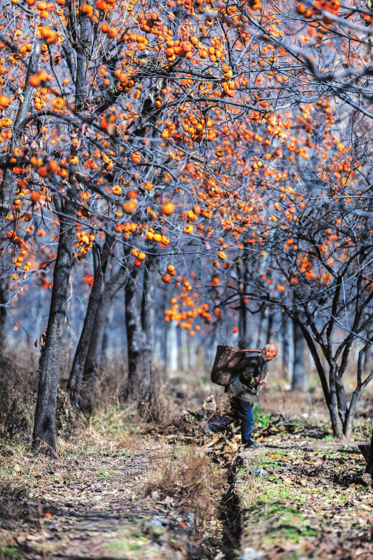 地頭那畔,景象便不同了。一對(duì)年輕的夫婦,正手腳利落地采摘、分揀柿子。竹籃里,橙紅的果實(shí)漸漸堆成小山。他們時(shí)而低語,聲音輕得像風(fēng)拂過枝梢,說的或許是今年柿子的成色,盤算著能賣個(gè)好價(jià)錢;或許是在憧憬,等這筆錢到手,該給娃添置些什么。他們額上有細(xì)密的汗珠,眉宇間有勞作后的倦色,但那份倦色底下,卻藏不住一股子蓬勃向上的勁兒,一種屬于明天的、清亮亮的盼頭。