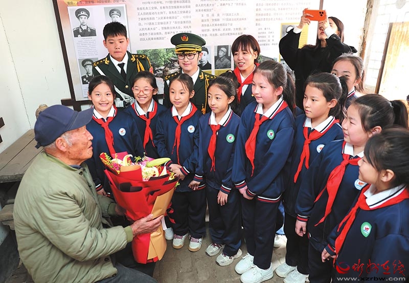 3月27日,忻州市七一路小學(xué)組織黨員、少先隊(duì)員走進(jìn)忻府區(qū)官莊村原忻縣(西)第一個(gè)紅色黨支部官莊黨支部舊址,開展“傳承紅色薪火,爭(zhēng)做新時(shí)代好隊(duì)員”主題活動(dòng),追憶崢嶸歲月,感悟革命精神。圖為老兵武三毛給孩子們講述抗戰(zhàn)故事。(記者 張存良攝