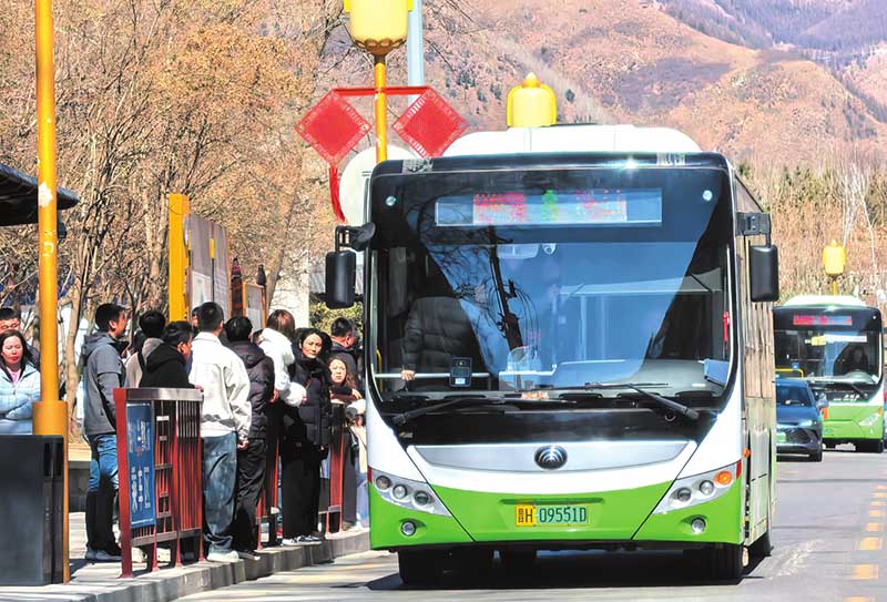 五臺山景區(qū)公交便捷惠民,核心區(qū)域?qū)嵭忻赓M乘坐,班次密集、覆蓋全域,為自由行游客出行保駕護航。圖為游客正在有序乘車。(
