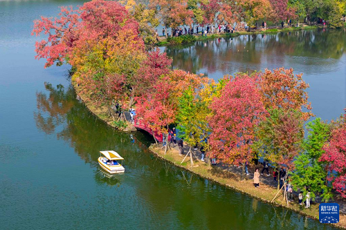 11月2日,游客在江蘇南京中山植物園月牙堤上賞秋游玩(無(wú)人機(jī)照片)。(新華社發(fā) 史俊 攝)