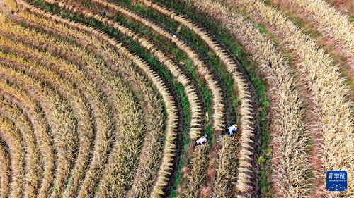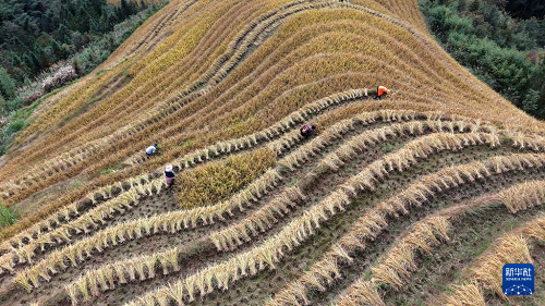 11月5日,龍脊鎮(zhèn)大寨村村民在梯田上收割水稻(無人機(jī)照片)。(新華社發(fā) 潘志祥 攝)