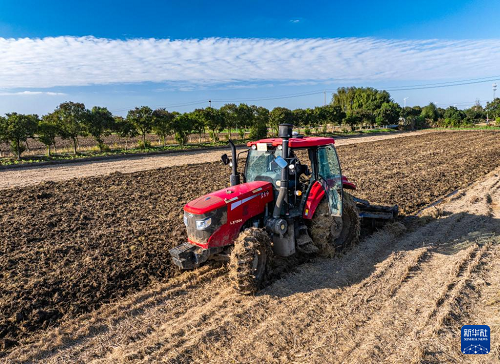 11月11日,農(nóng)民駕駛農(nóng)機(jī)在河南省焦作市溫縣黃河灘區(qū)播種小麥。(新華社發(fā) 黃福興 攝)