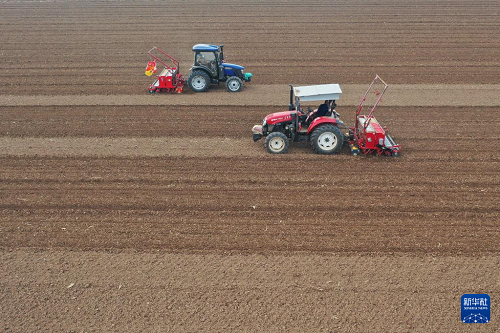 11月11日,河南省焦作市溫縣黃莊鎮(zhèn)常莊村村民駕駛播種機(jī)在田間播種小麥(無(wú)人機(jī)照片)。(新華社發(fā) 徐宏星 攝)