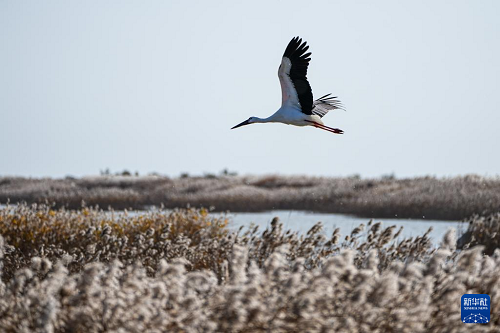 11月13日,在黃河三角洲國家級自然保護(hù)區(qū),白鸛在飛翔。(新華社記者 朱崢 攝)