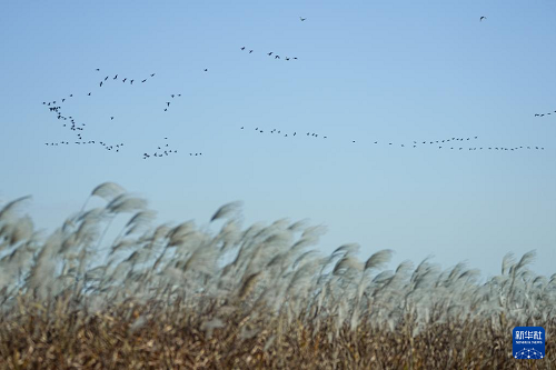 11月13日,在黃河三角洲國家級自然保護(hù)區(qū),越冬候鳥在飛翔。(新華社記者 朱崢 攝)