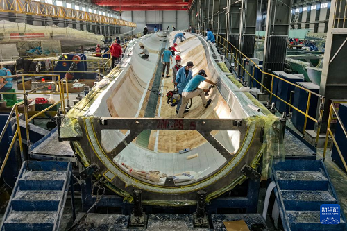 11月20日,在甘肅省酒泉經(jīng)濟技術(shù)開發(fā)區(qū)的甘肅九鼎風(fēng)電復(fù)合材料有限公司成型車間,工作人員進行風(fēng)機葉片鋪層作業(yè)(無人機照片)。(新華社記者 郎兵兵 攝)