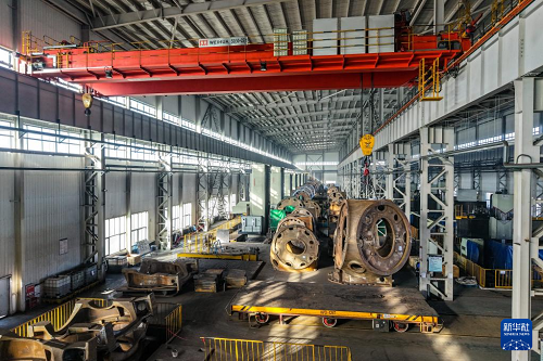 11月20日,在甘肅省酒泉經(jīng)濟技術(shù)開發(fā)區(qū)的日月重工(甘肅)有限公司機加車間,工作人員操作起重機轉(zhuǎn)運風(fēng)機輪轂(無人機照片)。(新華社記者 郎兵兵 攝)