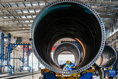 11月20日,在甘肅省酒泉經(jīng)濟技術(shù)開發(fā)區(qū)的中國水電四局(酒泉)新能源裝備有限公司塔筒制造車間,工作人員進行風(fēng)機塔筒焊接作業(yè)。(新華社記者 郎兵兵 攝)