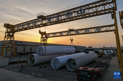 11月20日,在甘肅省酒泉經(jīng)濟技術(shù)開發(fā)區(qū)的中國水電四局(酒泉)新能源裝備有限公司裝運生產(chǎn)線上,工作人員進行風(fēng)機塔筒吊裝作業(yè)(無人機照片)。(新華社記者 郎兵兵 攝)