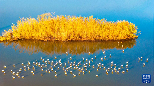 12月8日,群鳥在江蘇興化里下河國(guó)家濕地公園內(nèi)棲息、覓食(無(wú)人機(jī)照片)。(新華社發(fā) 周社根 攝)