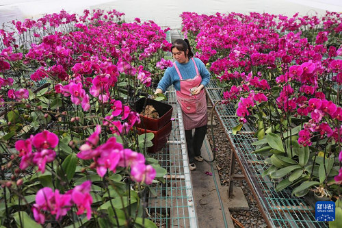12月23日,在江蘇省連云港市農(nóng)商控股集團(tuán)農(nóng)業(yè)科技公司花卉大棚,工作人員對蝴蝶蘭進(jìn)行組盆。(新華社發(fā) 耿玉和 攝)