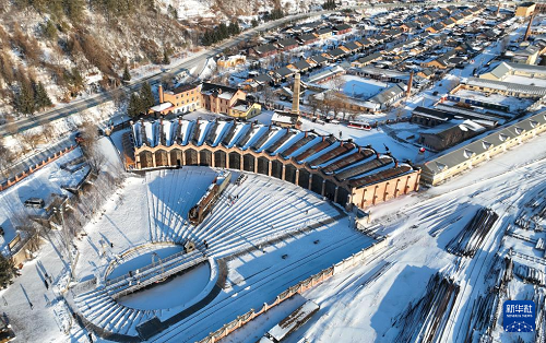 12月24日,游客參觀橫道河子鎮(zhèn)中東鐵路博物館機車庫展區(qū)(無人機照片)。(新華社發(fā) 徐率 攝)