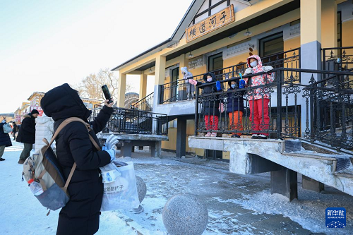 12月24日,游客在橫道河子鎮(zhèn)中東鐵路博物館前拍照。(新華社發(fā) 徐率 攝)