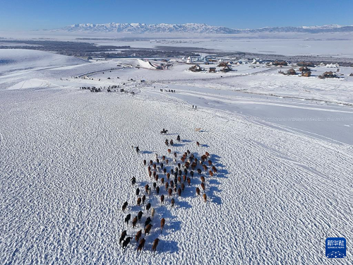 這是1月3日在新疆昭蘇濕地公園拍攝的“天馬踏雪”表演(無人機(jī)照片)。(新華社記者 胡虎虎 攝)