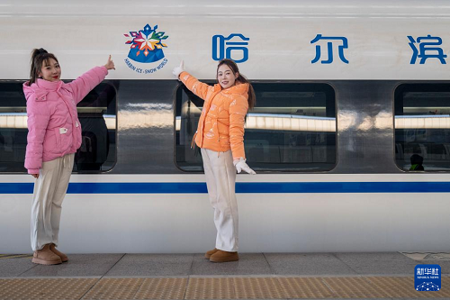 1月4日,演職人員在“哈爾濱冰雪大世界”主題高鐵列車(chē)G1276前合影。(新華社記者 張濤 攝)