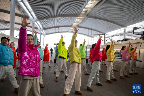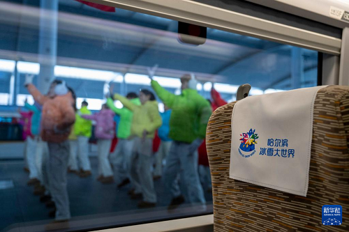 1月4日,演職人員在“哈爾濱冰雪大世界”主題高鐵列車(chē)G1276外表演。(新華社記者 張濤 攝)