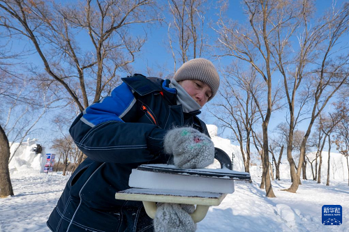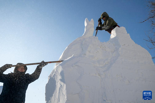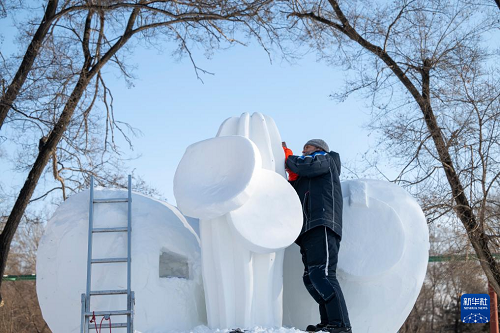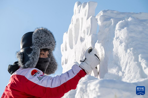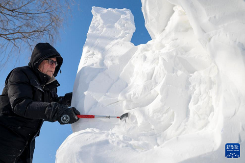 1月7日,在哈爾濱太陽島雪博會園區(qū),來自13個國家的25支代表隊(duì)百余位藝術(shù)家在寒冬中堅持藝術(shù)創(chuàng)作,精雕細(xì)琢雪雕作品。