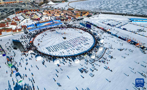 1月8日,在吉林省松原市,人們參加吉林·查干湖第24屆冰雪漁獵文化旅游節(jié)開幕式(無(wú)人機(jī)照片)。(新華社記者 顏麟蘊(yùn) 攝)