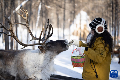 1月15日,游客在根河市敖魯古雅鄂溫克民族鄉(xiāng)敖魯古雅使鹿部落景區(qū)與馴鹿互動(dòng)。(新華社記者 徐嘉懿 攝)