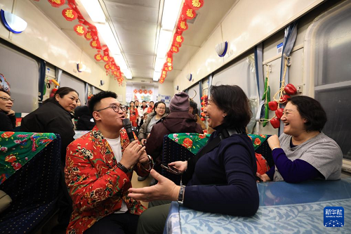 1月19日,來(lái)自馬來(lái)西亞的游客(右二)在K7041次“東北民俗”主題列車(chē)上與主持人互動(dòng)。(新華社發(fā) 徐率 攝)