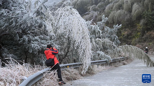 1月21日,一名攝影師在三江侗族自治縣大塘坳水庫(kù)附近拍攝冰凌。(新華社記者 張愛林 攝)