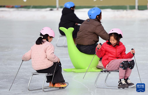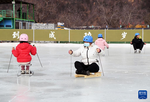 1月28日,在北京市平谷區(qū)鎮(zhèn)羅營鎮(zhèn)湖畔耕讀園,游客在活動現(xiàn)場滑冰車。(新華社記者 任超 攝)