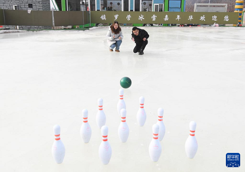 1月28日,在北京市平谷區(qū)鎮(zhèn)羅營鎮(zhèn)湖畔耕讀園,游客在活動現(xiàn)場體驗(yàn)“冰上保齡球”。(新華社記者 任超 攝)