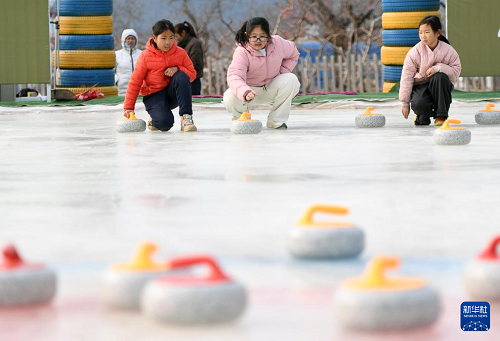 1月28日,在北京市平谷區(qū)鎮(zhèn)羅營鎮(zhèn)湖畔耕讀園,小朋友們在活動現(xiàn)場體驗(yàn)冰壺。(新華社記者 任超 攝)