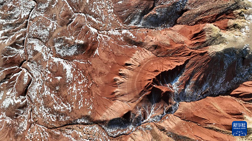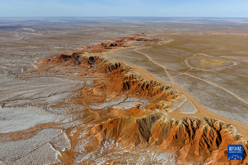 這是1月29日在內(nèi)蒙古烏蘭察布市四子王旗拍攝的紅崖臺地景觀(無人機(jī)照片)。(新華社記者 貝赫 攝)