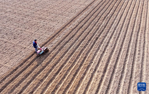 2月13日,在山東省棗莊市山亭區(qū)桑村鎮(zhèn),農(nóng)民駕駛農(nóng)機(jī)開溝準(zhǔn)備播種馬鈴薯(無人機(jī)照片)。(新華社發(fā) 李宗憲 攝)