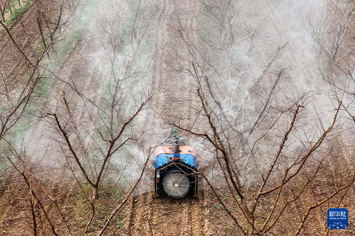 3月19日,山西省運城市平陸縣張村鎮(zhèn)的農(nóng)民為果樹噴灑農(nóng)藥(無人機(jī)照片)。(新華社記者 曹陽 攝)