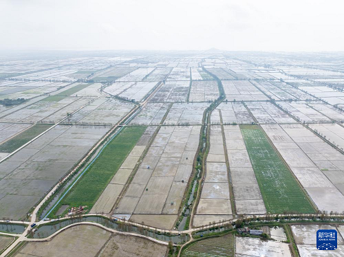 3月24日,在廣東江門臺山市都斛鎮(zhèn),農業(yè)無人機在插好秧苗的田間作業(yè)(無人機照片)。(新華社記者 毛思倩 攝)