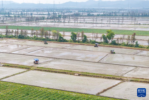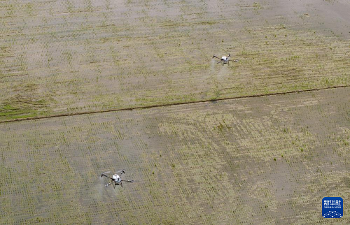 3月24日,在廣東江門臺山市都斛鎮(zhèn),農業(yè)無人機在插好秧苗的田間作業(yè)。(新華社記者 毛思倩 攝)