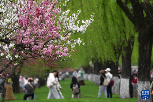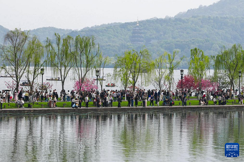 4月2日,游客在杭州西湖景區(qū)的白堤上游覽?!伴g株楊柳間株桃”是西湖白堤特有的景觀。(新華社記者 黃宗治 攝)