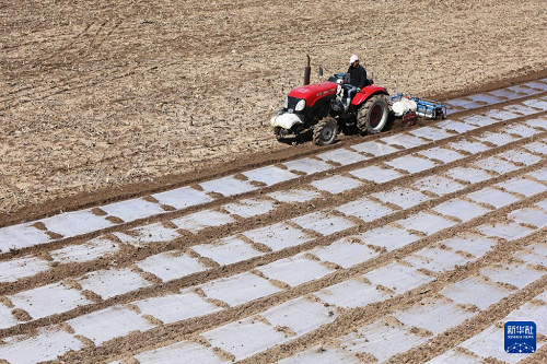 4月1日,農機手駕駛農機在甘肅省天水市武山縣馬力鎮(zhèn)的田間覆地膜。(新華社發(fā) 王克賢 攝)