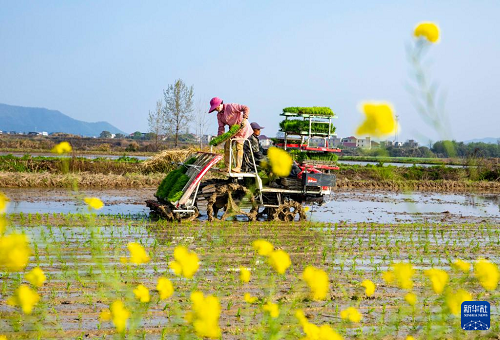4月1日,江西省九江市都昌縣蔡嶺鎮(zhèn)楊灣村,農民駕駛農機在田間機插早稻。(新華社發(fā) 傅建斌 攝)