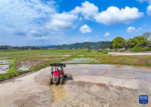 4月1日,湖南省常寧市蘭江鄉(xiāng)景星村,農機手駕駛農機翻耕農田,準備機插早稻秧苗(無人機照片)。(新華社發(fā) 周秀魚春 攝)