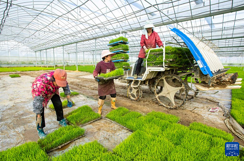 4月1日,農民在江西省九江市都昌縣蔡嶺鎮(zhèn)楊灣村育秧基地起運秧苗,準備機插早稻。(新華社發(fā) 傅建斌 攝)