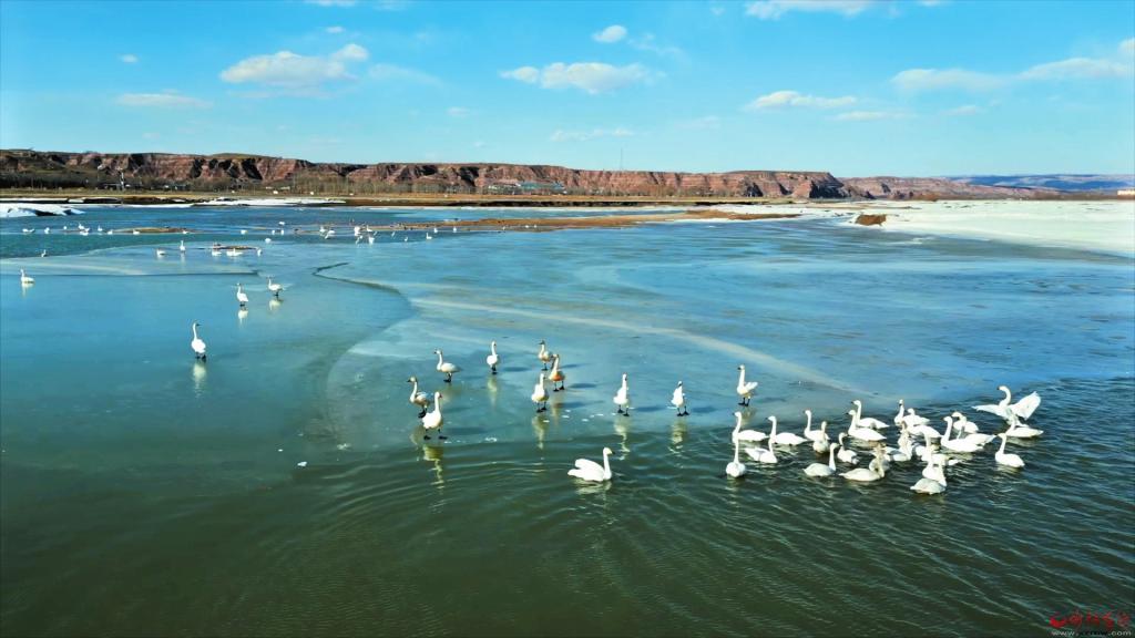 入春,黃河開河以來,成百上千的白天鵝翩躚而至,成為河曲娘娘灘水域的一道風景線。(楊成林 攝