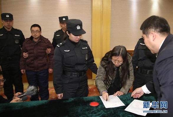 2月6日,在北京首都機(jī)場,檢察官向“百名紅通”嫌犯付耀波(右五)、張清曌(右二)宣讀相關(guān)法律文書。當(dāng)日,在中央追逃辦統(tǒng)一部署下,在外交部、公安部及我駐巴巴多斯、格林納達(dá)等駐外使館的大力協(xié)助下,遼寧省追逃辦組織協(xié)調(diào)檢察、公安等部門,成功將遠(yuǎn)逃至加勒比海島國圣文森特和格林納丁斯的“百名紅通”第39號嫌犯付耀波、第41號嫌犯張清曌同時抓獲歸案。新華社記者殷剛攝