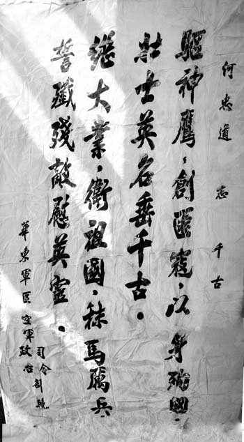 何忠道的犧牲,引起了整個(gè)空軍系統(tǒng)的震憾,人民空軍舉行了隆重的追悼大會(huì)??哲姍C(jī)關(guān)、華東軍區(qū)、生前所在部隊(duì)機(jī)關(guān)、戰(zhàn)友送了幾十幀挽幛。空軍司令員劉亞樓、副司令員常乾坤、副政委吳法憲、參謀長(zhǎng)王秉璋聯(lián)名敬獻(xiàn)的挽幛上書:“殲滅美國(guó)侵略者,堅(jiān)決保衛(wèi)祖國(guó)領(lǐng)空,為何忠道同志復(fù)仇!”華東軍區(qū)司令部、政治部敬獻(xiàn)的挽幛上書:“驅(qū)神鷹,創(chuàng)飛寇,以身殉國(guó),壯士英名垂千古。創(chuàng)大業(yè),衛(wèi)祖國(guó),秣馬厲兵,誓殲殘敵慰英靈?!?/p>