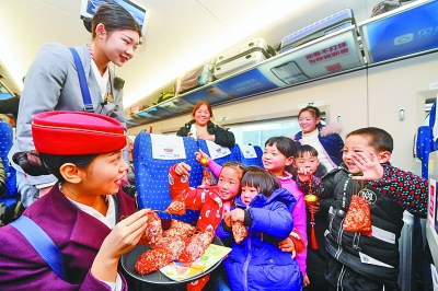 1月24日,在重慶開往福州的G1755次列車上,乘務(wù)員和“小候鳥”做游戲。春運(yùn)期間,大批務(wù)工人員子女隨長輩踏上與父母團(tuán)聚的旅途,南鐵福州客運(yùn)段提前對重點(diǎn)線路乘務(wù)組進(jìn)行兒童陪護(hù)培訓(xùn),在列車上準(zhǔn)備了書本和玩具,用愛心護(hù)航“小候鳥”的團(tuán)圓路。新華社記者 宋為偉攝
