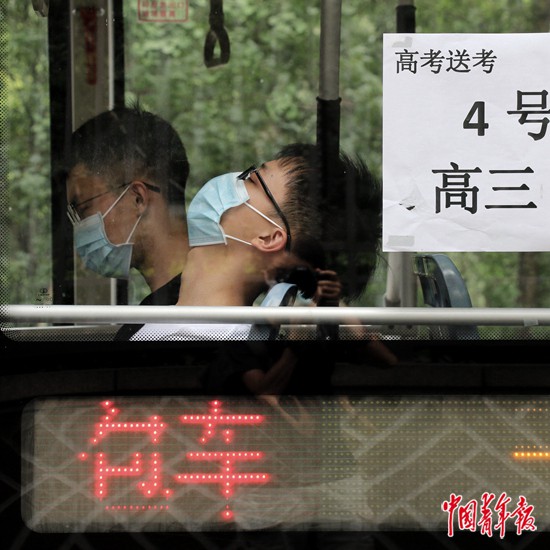 7月7日上午,四川省成都市,剛剛參加完高考語文考試的一位考生坐在車上閉目養(yǎng)神。由于考點不在本校,這位學生所在的學校安排了專車接送考生。中青報·中青網記者 王鑫昕/攝