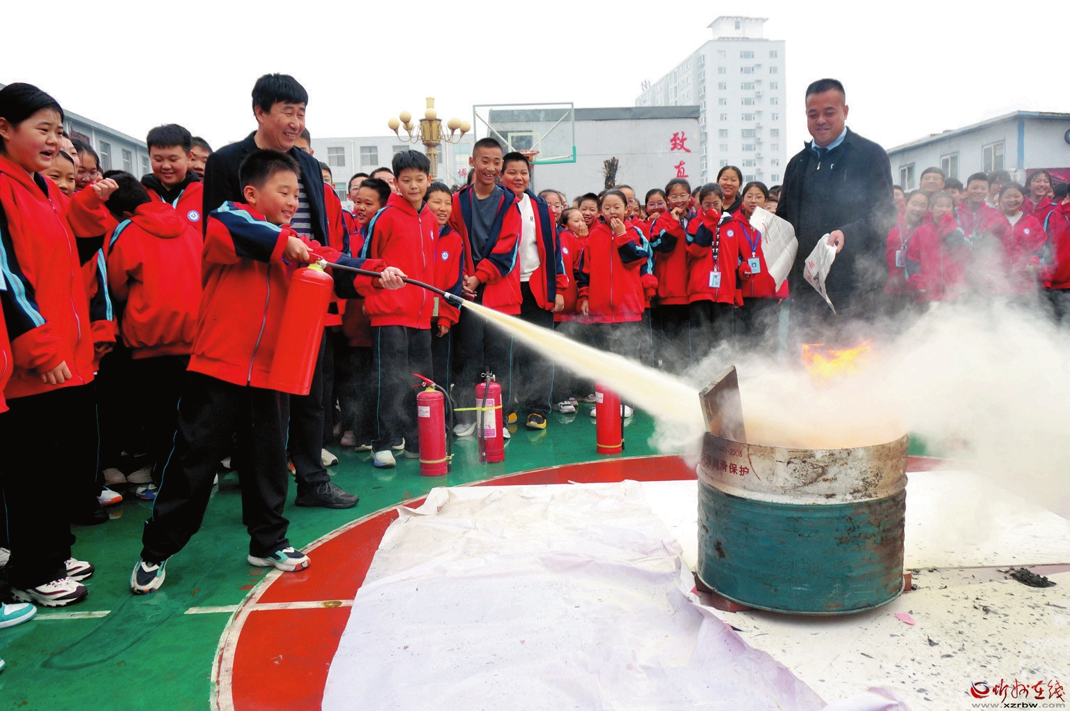 為了提升學(xué)?;馂?zāi)疏散組織和管理能力,強化師生安全意識,培養(yǎng)師生的自救能力,10月31日,忻州市第七中學(xué)舉行消防應(yīng)急疏散演練。圖為學(xué)生使用滅火器滅火。(張卯芳 攝