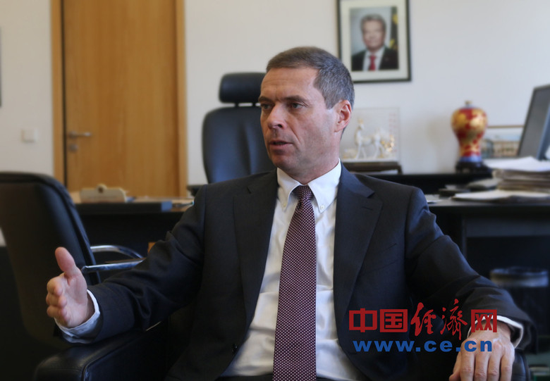 采訪結(jié)束后,中國經(jīng)濟(jì)網(wǎng)記者向柯慕賢介紹中國國家重點(diǎn)新聞媒體的基本情況??釔坶L跑的柯慕賢工作起來就像德國的汽車,馬力十足。性格穩(wěn)重的他半開玩笑地告訴記者,對德國人來說,壓力是塊寶,壓力帶來動力。中國經(jīng)濟(jì)網(wǎng)記者 劉若星 攝