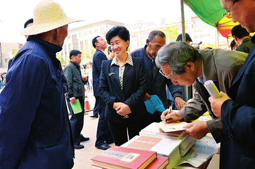 圖為陳義青(中)同參加讀書宣傳活動(dòng)的群眾交談。 (張銀枝 攝)